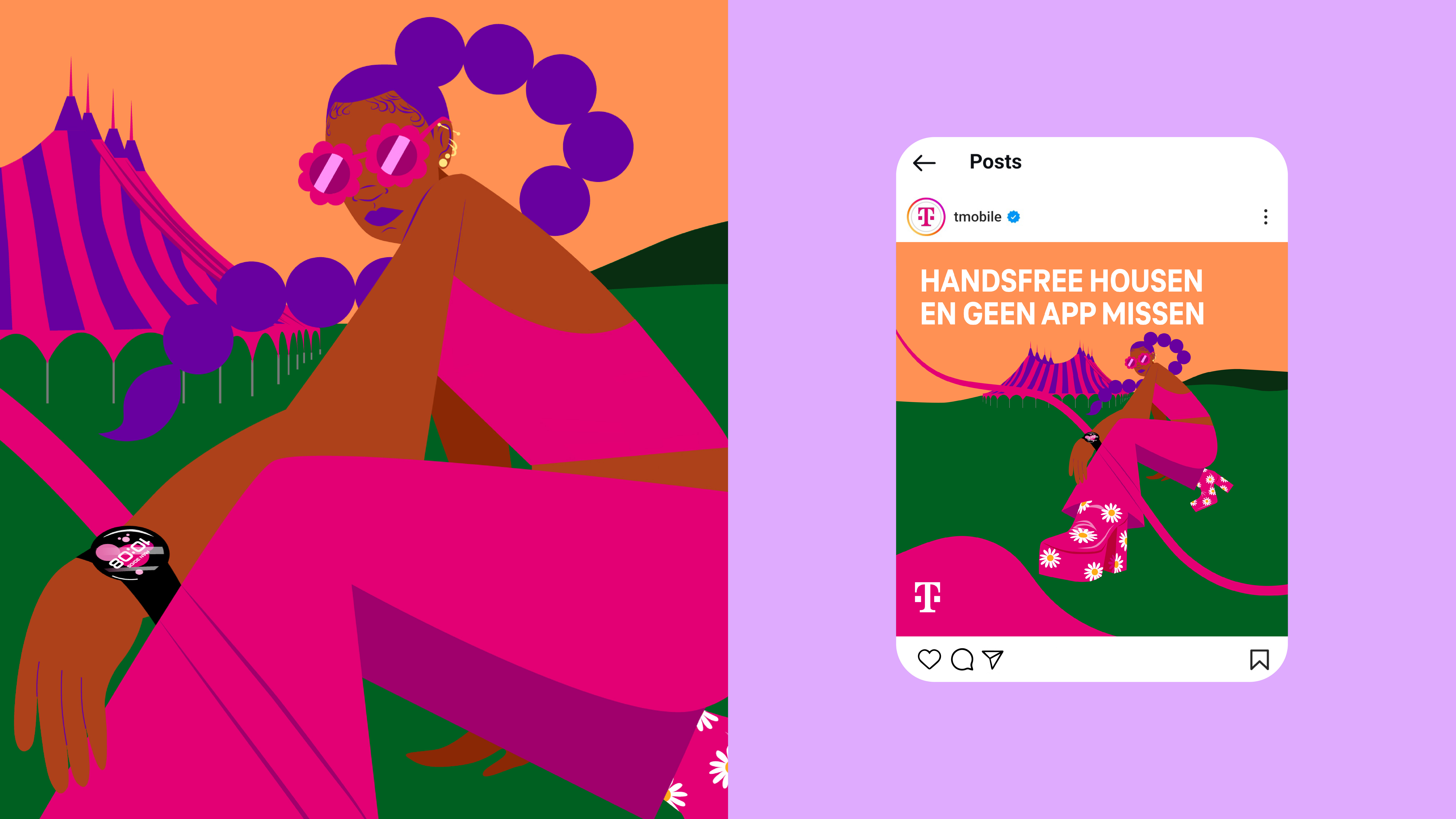 Le résultat final présente une série de personnages, exagérés avec une perspective grand angle pour accentuer le dynamisme, et une palette de couleurs audacieuses incluant le magenta emblématique de la marque T-Mobile. Les illustrations mettent également l'accent sur la diversité et l'inclusivité, en représentant des personnes de différents genres et couleurs de peau.